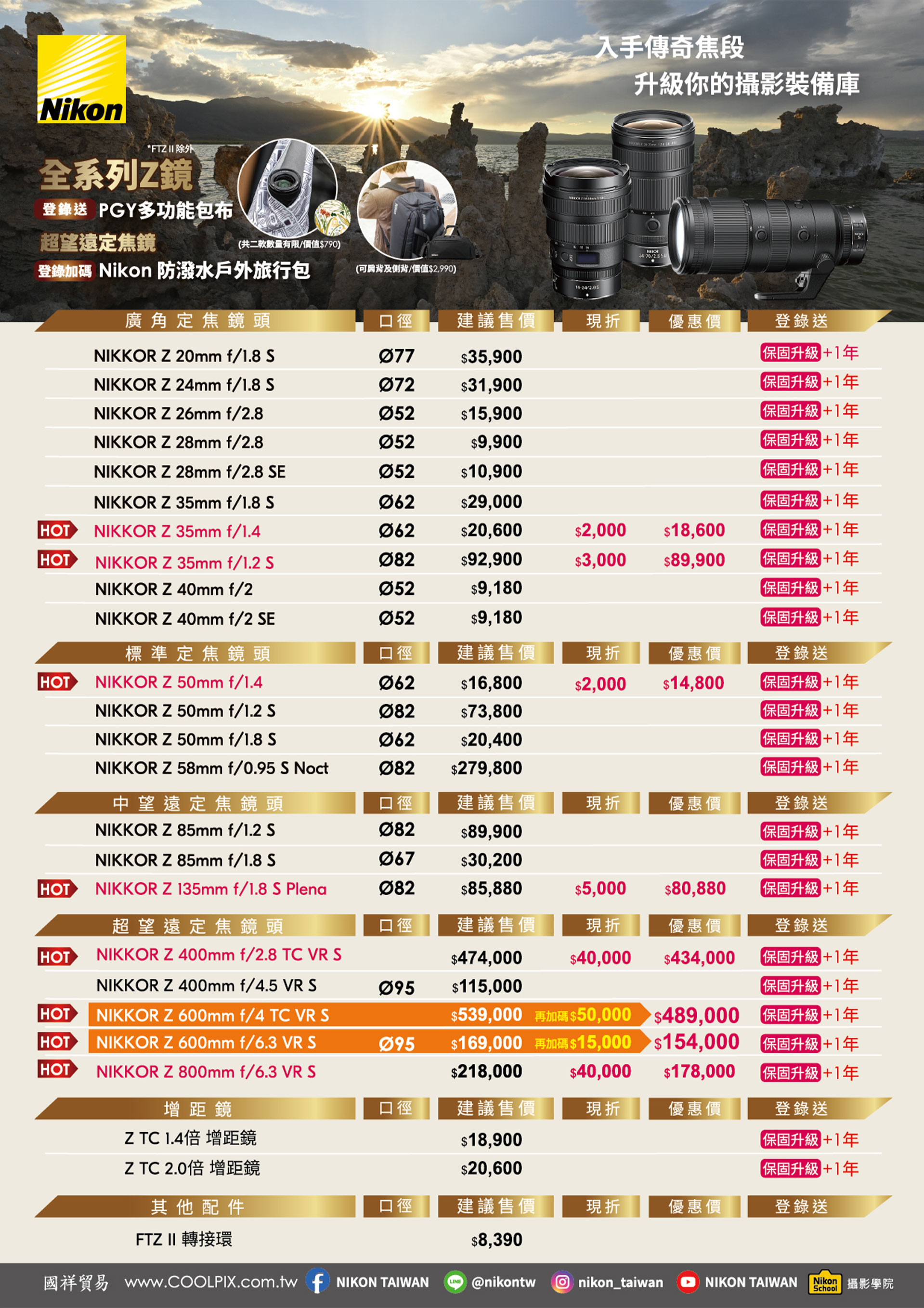 🔥115/4/1~115/5/31🔥活動期間購買現折5,000元,Z系列鏡頭登錄贈保固升級2年 + PGY多功能包布