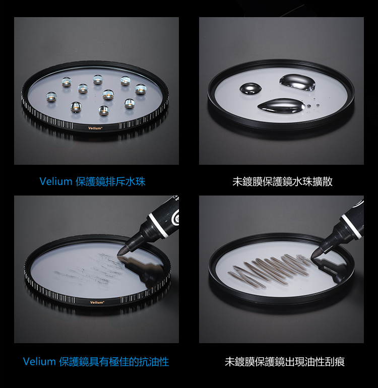 新研發的鍍膜使落在濾鏡表面的水滴產生更強的匯聚力,同時抗油性能也相當好。就算偶爾出現水點和指紋,也能非常容易的清除掉。