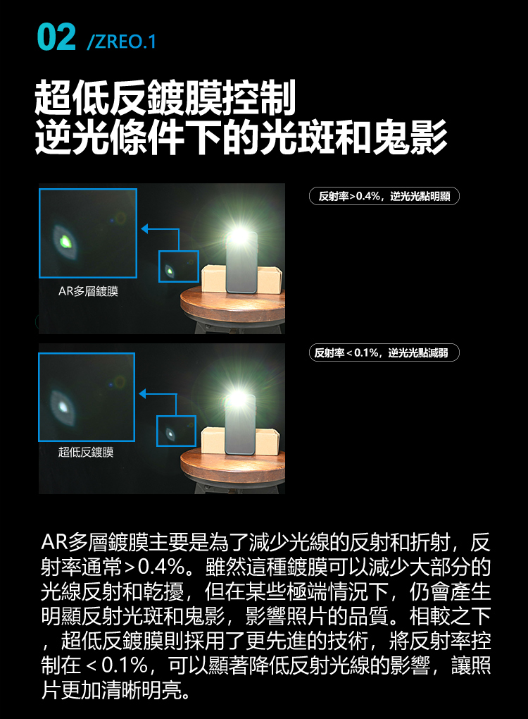 AR多層鍍膜主要是為了減少光線的反射和折射,反射率通常>0.4%。雖然這種鍍膜可以減少大部分的光線反射和乾擾,但在某些極端情況下,仍會產生明顯反射光斑和鬼影,影響照片的品質。相較之下,超低反鍍膜則採用了更先進的技術,將反射率控制在<0.1%,可以顯著降低反射光線的影響,讓照片更加清晰明亮。